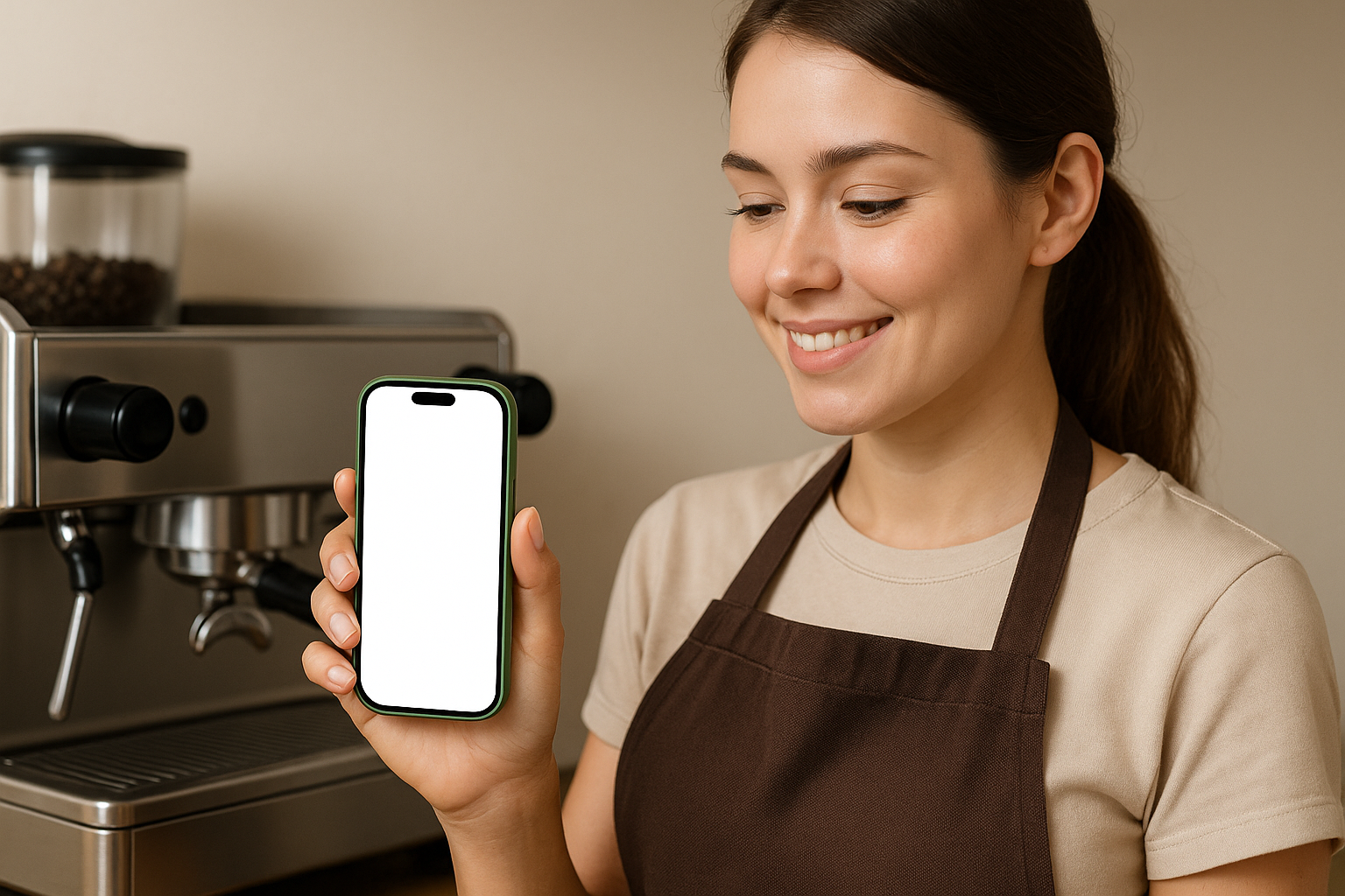 A smiling barista in a brown apron holds a green smartphone with a blank screen. The backdrop features a coffee machine, creating a warm café atmosphere.