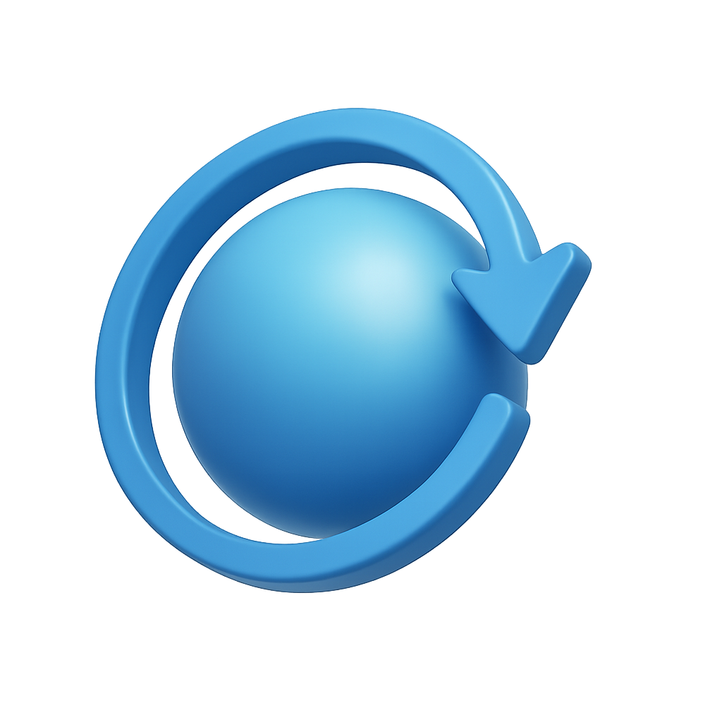 A sleek, 3D circular arrow encircles a smooth blue sphere, featuring a three-quarter view and a glossy finish, set against a subtle gradient background.