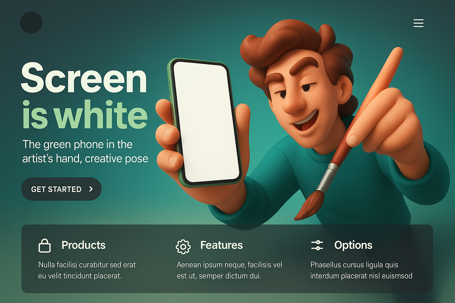 A vibrant landing page design featuring a 3D character holding a green phone. The screen is blank, set against a smooth gradient background, with sections for products and features.