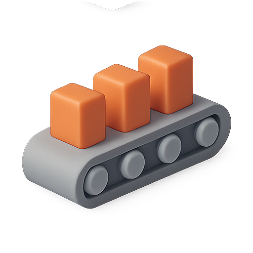 A modern 3D graphic of three orange blocks positioned on a gray conveyor belt, suitable for applications in technology, manufacturing, or design contexts.
