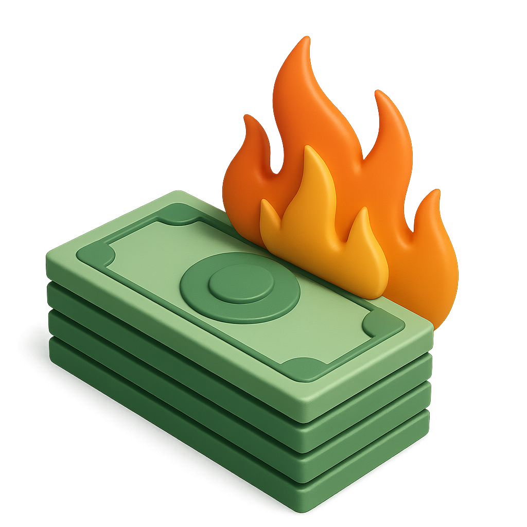 Stylized 3D Burn-Rate Icon with Cash and Flames