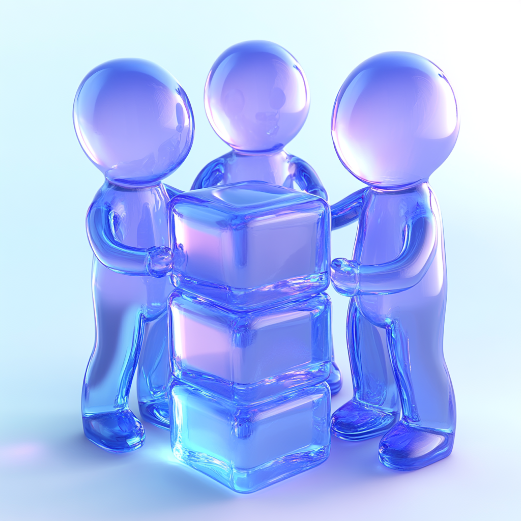 A modern 3D illustration of three transparent figures collaborating to stack blocks, showcasing teamwork and creativity. Ideal for concepts related to collaboration and innovation.