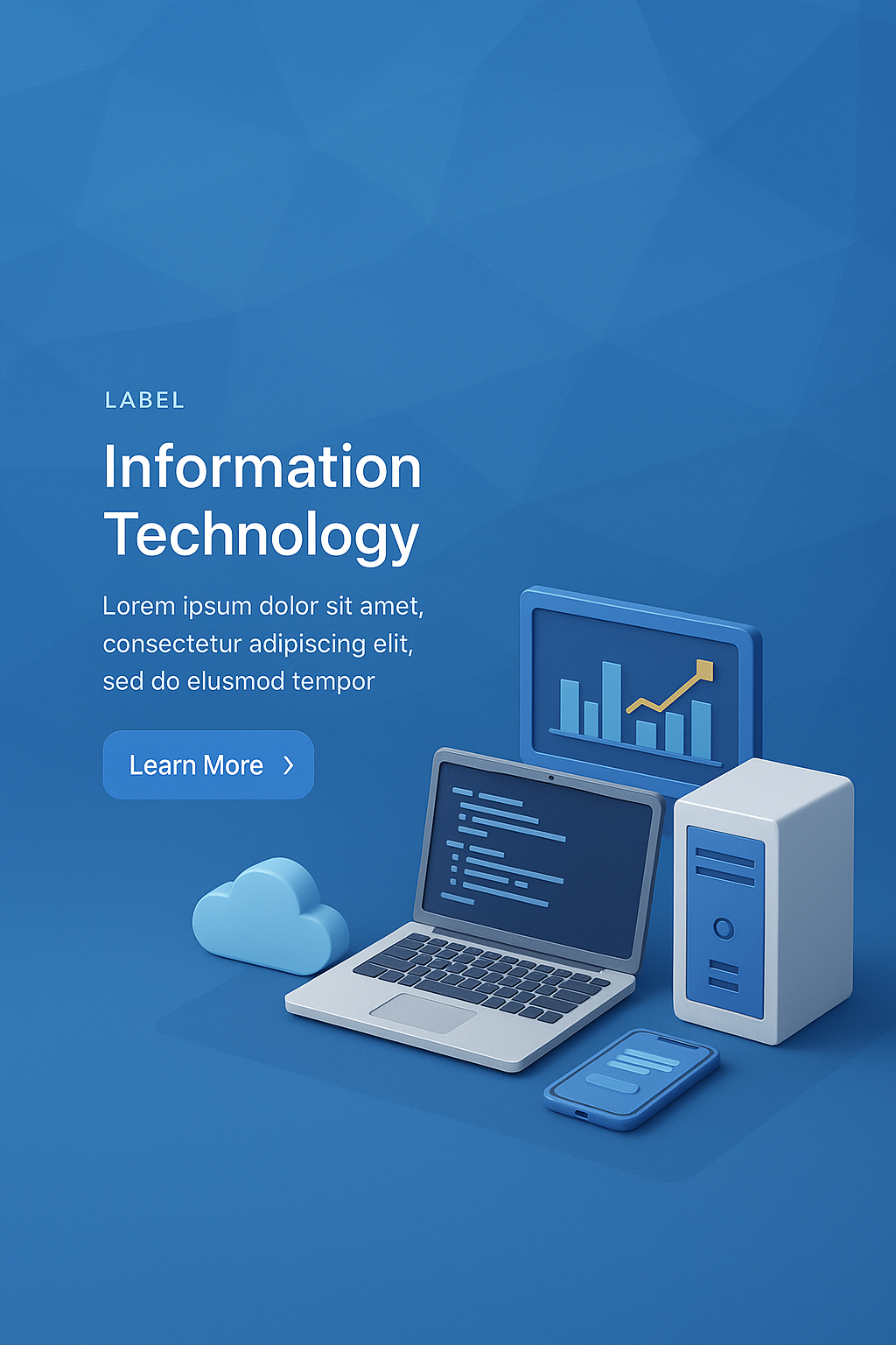 A sleek, zoomed-out 3D illustration featuring blue triangles, a laptop, and a cloud icon. The design emphasizes information technology with minimal text and a call-to-action button.