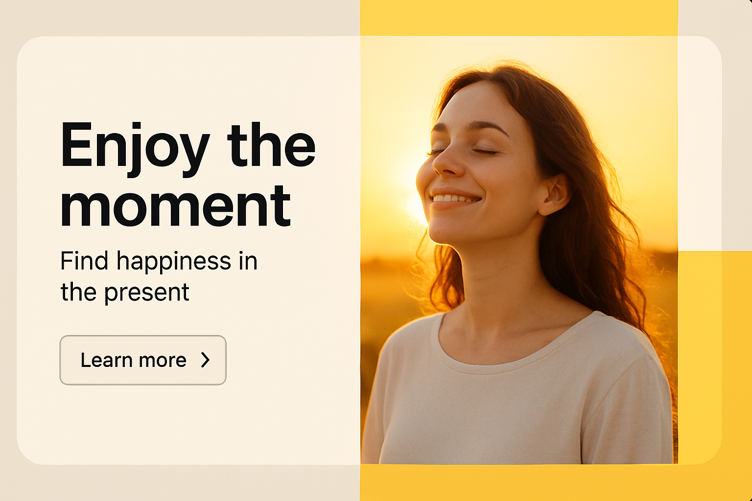A backlit portrait of a joyful woman with closed eyes, enjoying a serene moment at sunset in a field. The composition features bright geometric blocks and modern typography.