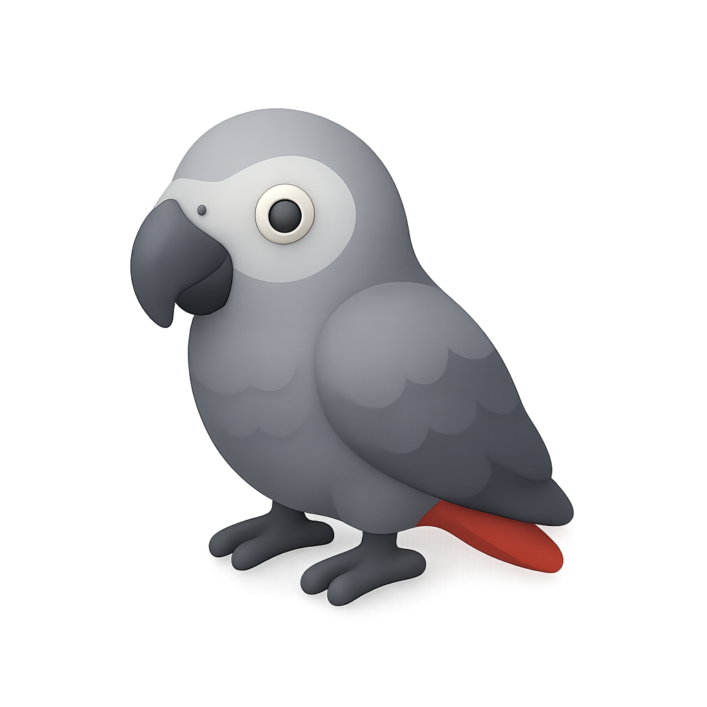 A charming cartoon-style illustration of a gray parrot with a simplistic design. Ideal for children's books, educational materials, or pet-related content.