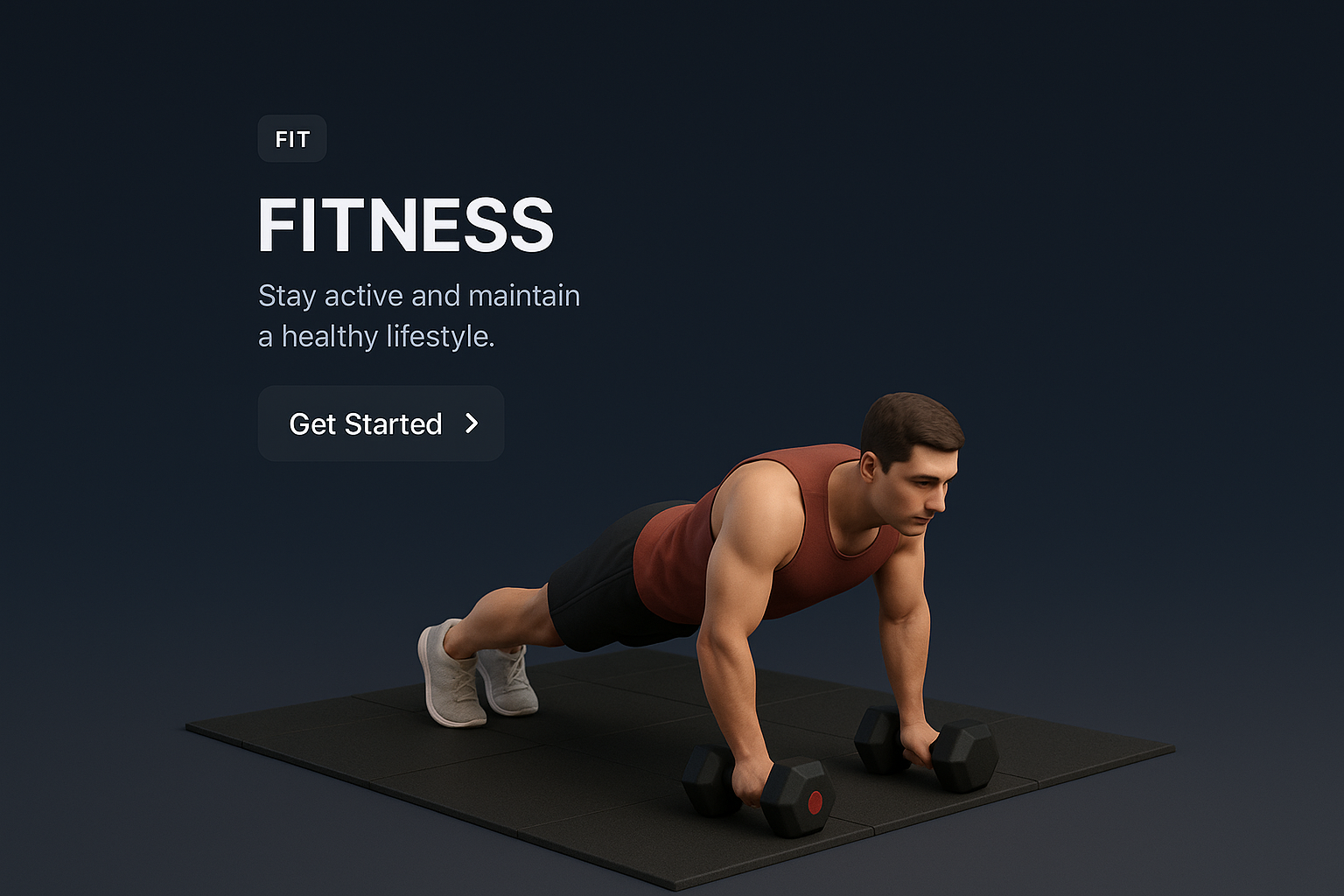 /Collection: /by davooda/Type: PNG/A realistic 3D scene depicting a man exercising with dumbbells on a dark gradient background. The layout includes a prominent fitness header and a call-to-action button.
