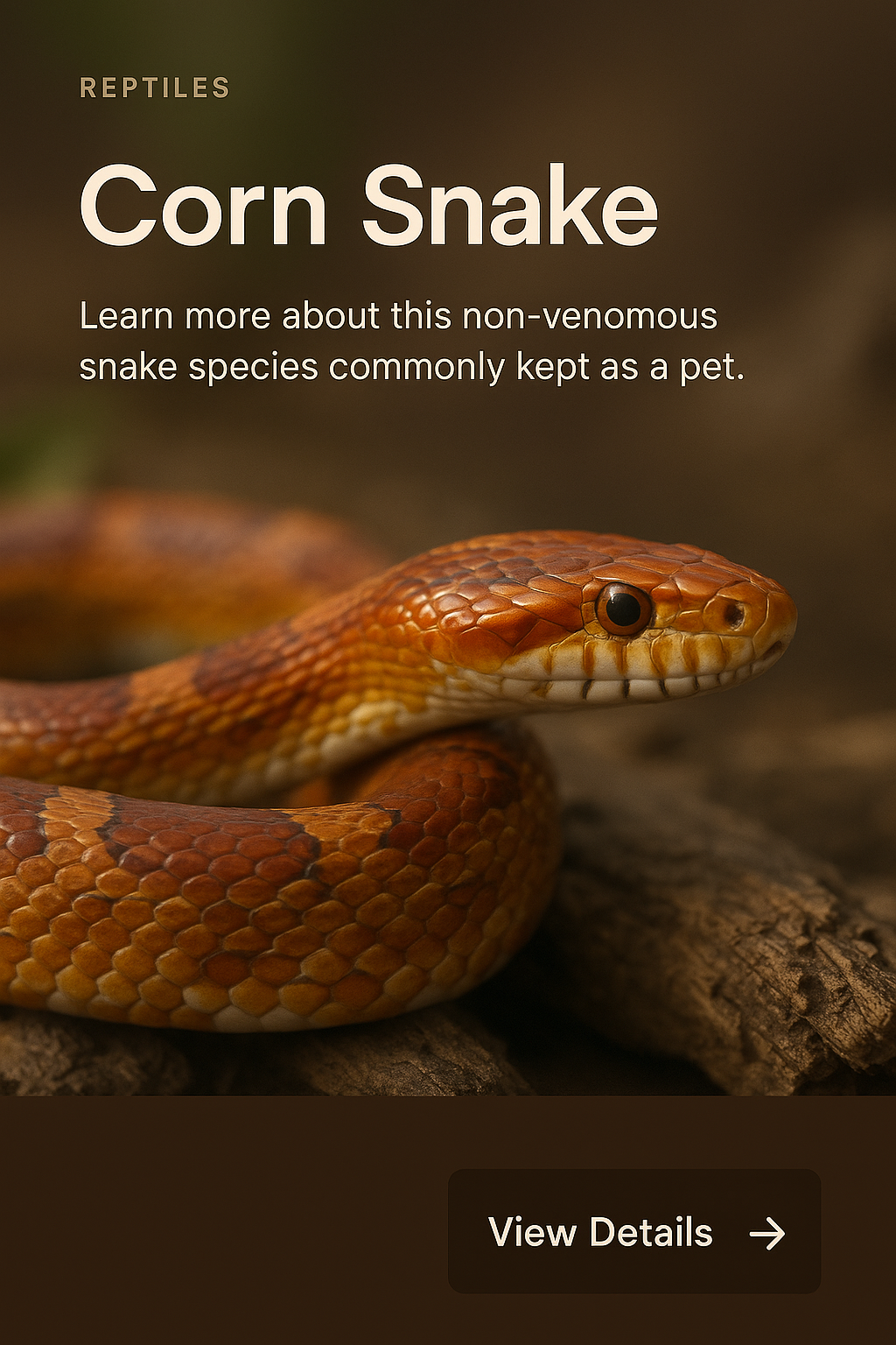 A sleek web design showcasing a corn snake, featuring a small label and concise text block. The call-to-action button invites users to learn more about this pet-friendly snake species.