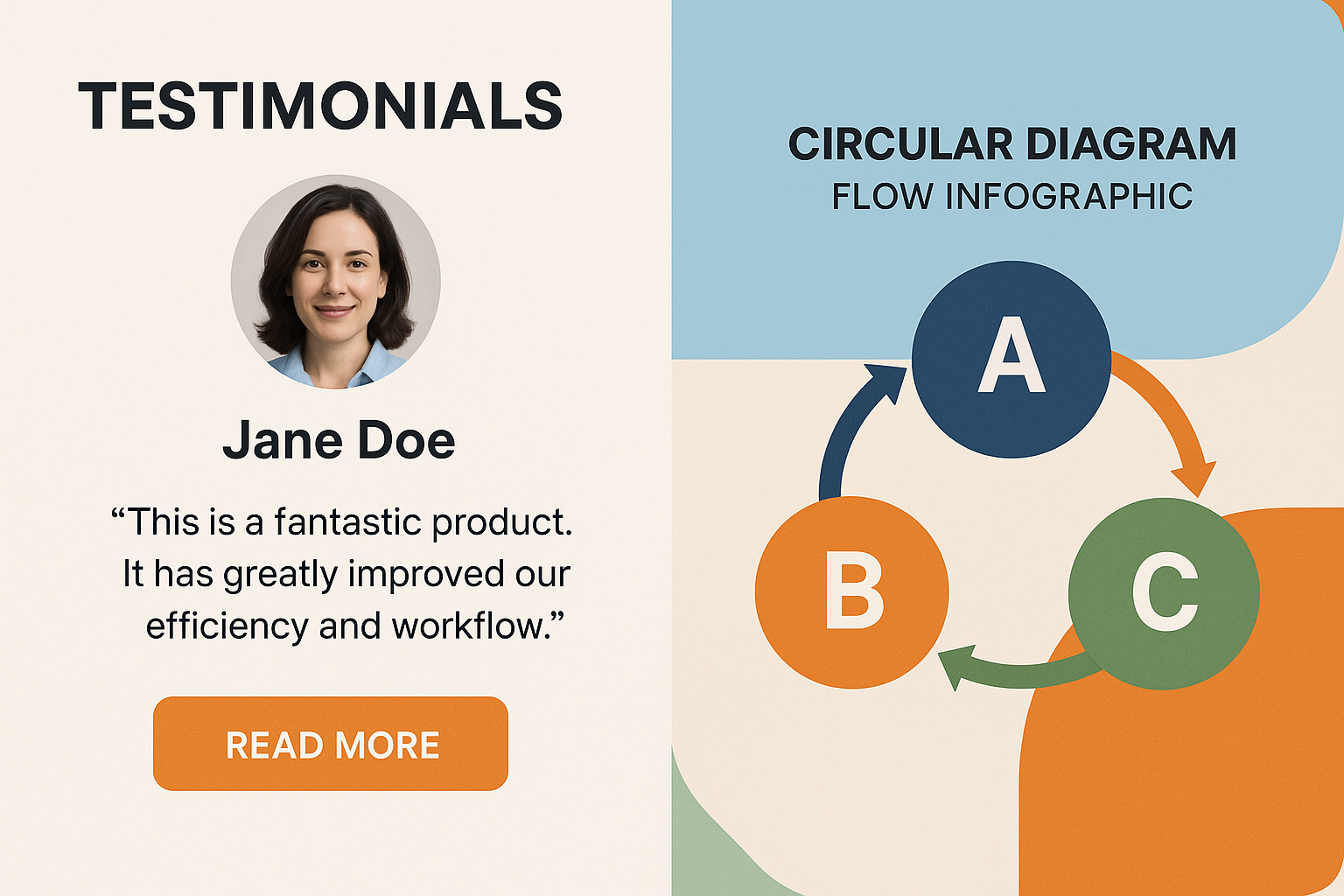 /Collection: /by davooda/Type: PNG/A modern testimonial design featuring a circular photo and testimonial text. Includes a flow infographic with geometric shapes and clear typography, emphasizing professionalism and clarity.