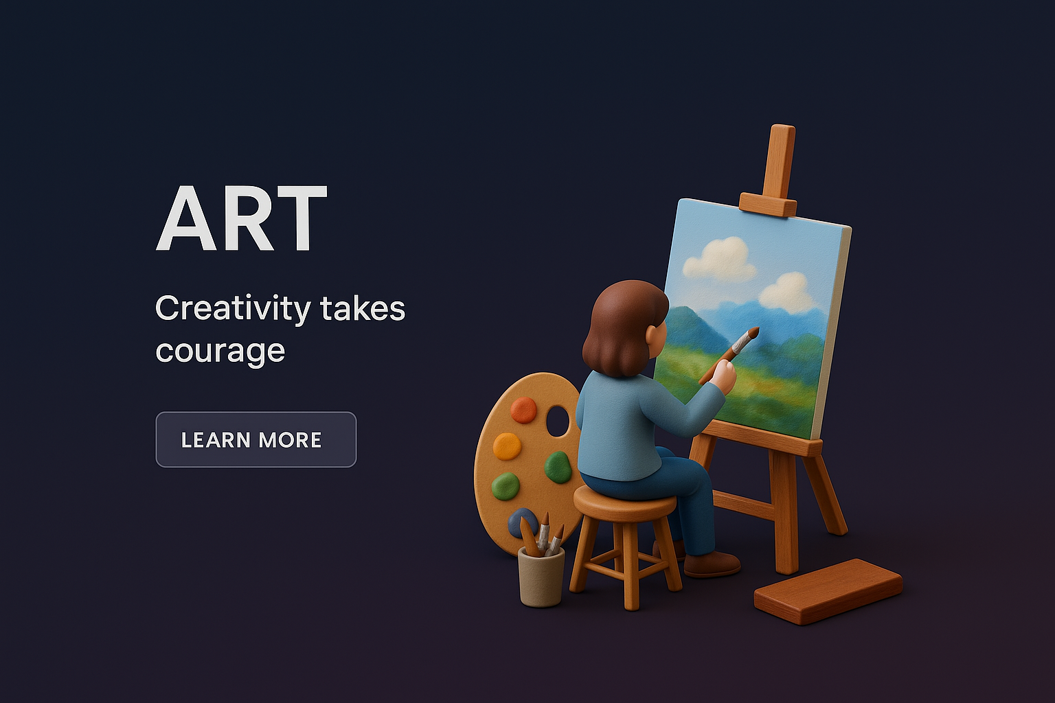 /Collection: /by davooda/Type: PNG/A 3D illustration of an artist painting a landscape on an easel, with a palette beside them. The dark background enhances the vibrant colors of the scene, emphasizing creativity.