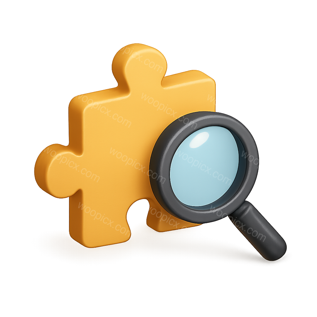 A 3D rendered yellow puzzle piece alongside a magnifying glass, creating a visually appealing and isometric design with a transparent background.