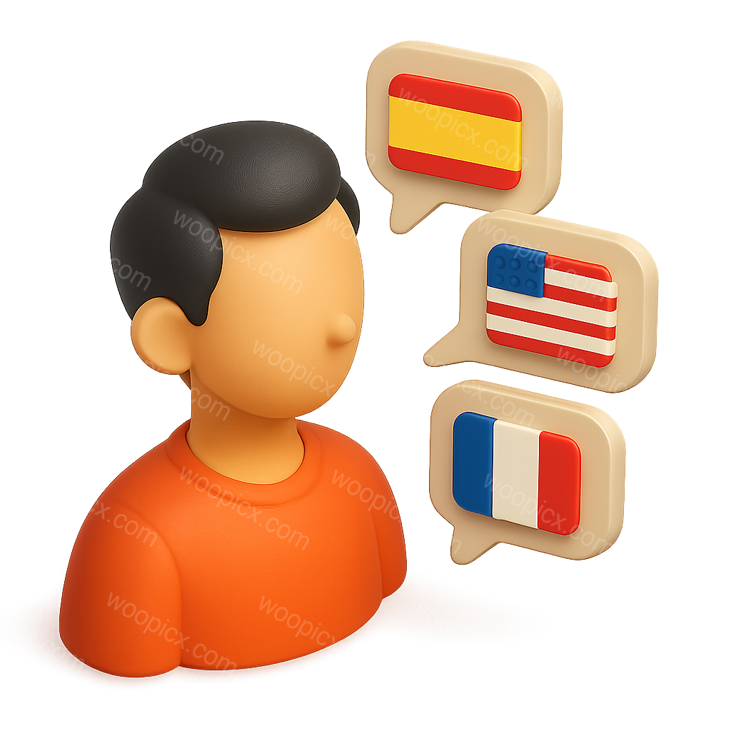 A 3D icon representing a person with speech bubbles featuring flags of Spain, the USA, and France, symbolizing multilingual communication. The design has a vibrant and friendly aesthetic.