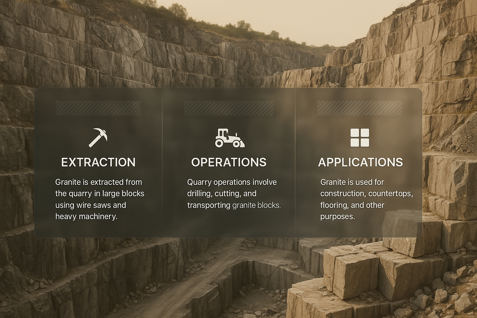 A modern web page design featuring a granite quarry theme, showcasing three horizontal blocks with integrated text and icons, set against a light background.