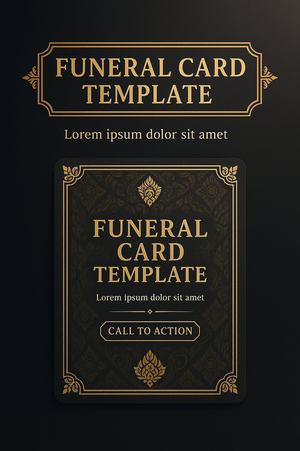 A dignified funeral card template featuring ornate golden design elements on a dark background, suitable for memorial services and tributes.