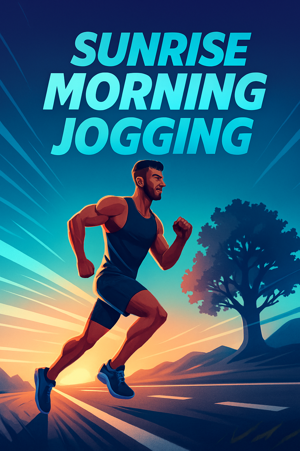 An energetic illustration of a male athlete jogging during sunrise. The scene features vibrant colors, dynamic lines radiating outward, and a silhouette of a tree in the background, creating a sense of motion.