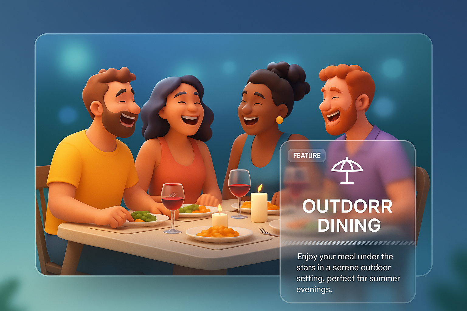 A lively group of friends sharing laughter and enjoying dinner at an outdoor restaurant, illuminated by soft lights, creating a warm summer evening atmosphere.
