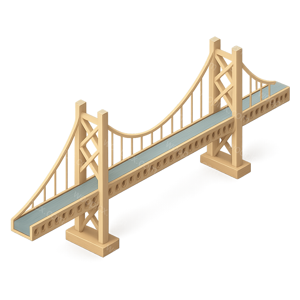 /Premium/Collection: /by davooda/Type: PNG/A stylized 3D icon of the Akashi Bridge, represented in a three-quarter view. The design features a wooden structure with volumetric elements and a transparent background.