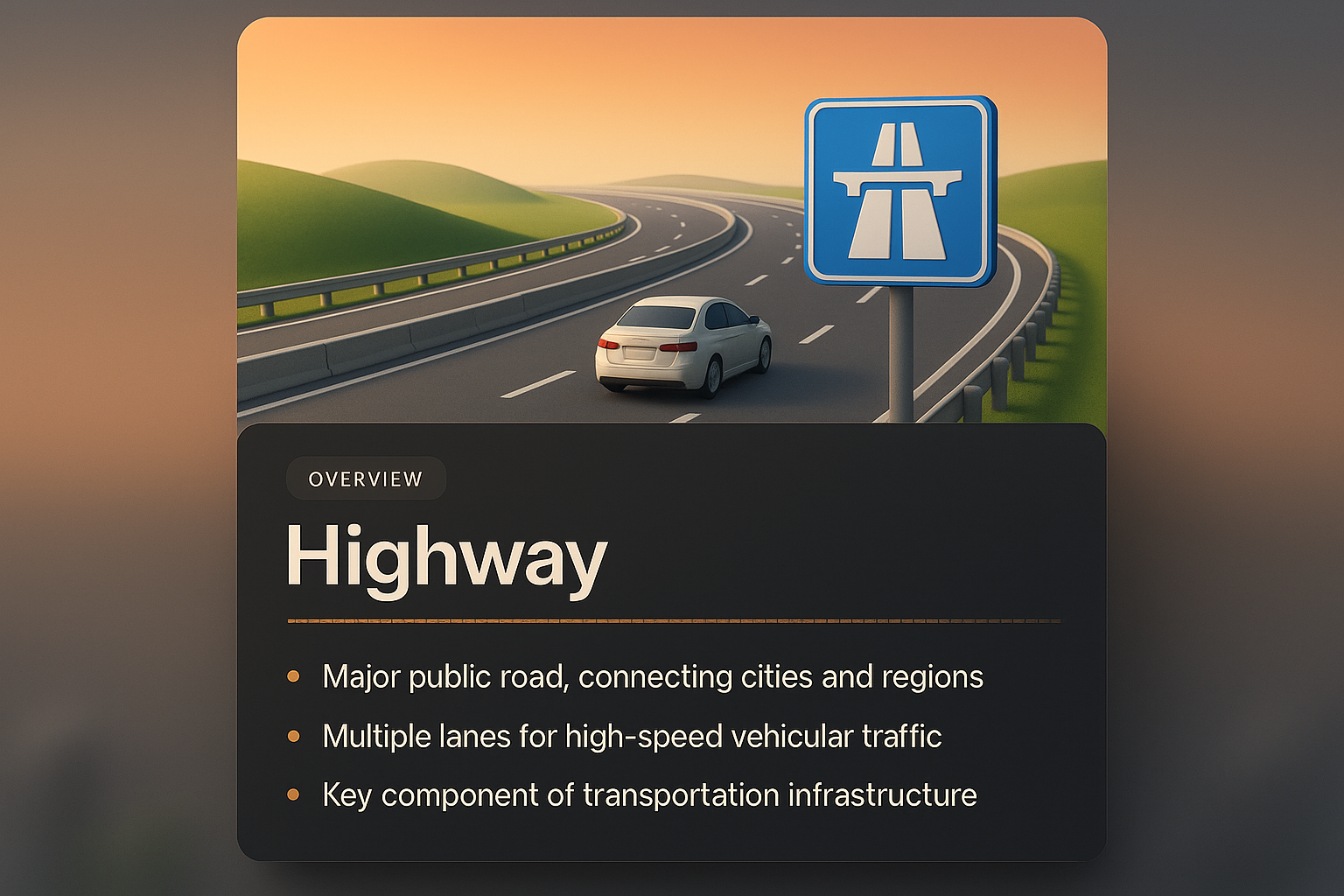/Collection: /by davooda/Type: PNG/A 3D illustration of a highway scene featuring a car driving on a multi-lane road, complemented by an informative overlay block detailing the highway's significance.