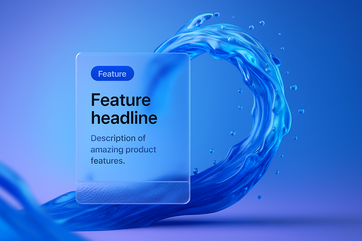 /Collection: /by davooda/Type: PNG/A vibrant blue water swirl creates a dynamic backdrop for a transparent feature block displaying product information. The splash includes bubbles, adding a lively touch.