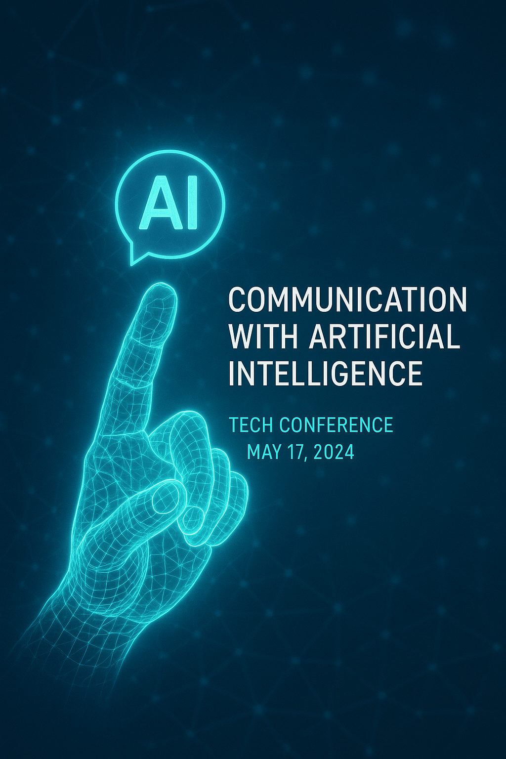 Sleek promotional graphic for a tech conference featuring a glowing wireframe hand pointing at an AI speech bubble. Ideal for event marketing in the tech industry.