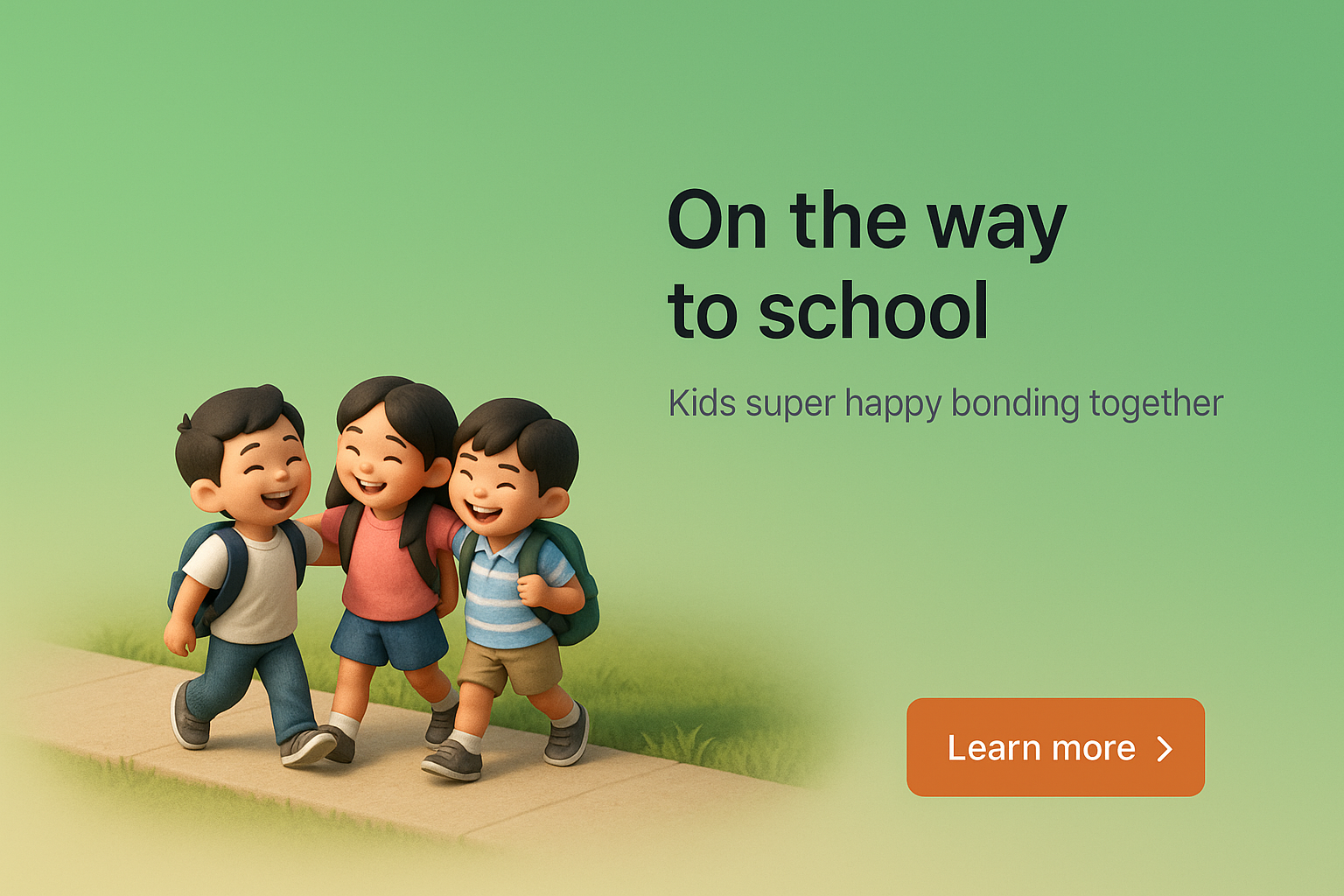 A delightful scene of three Asian children walking together to school, showcasing their happiness and camaraderie. The image captures a vivid, playful atmosphere with a soft gradient background.