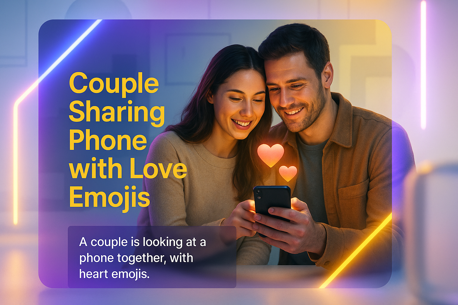 Warm and intimate image of a couple sharing a phone, enhanced with heart emojis, ideal for relationship-themed content or social media posts.