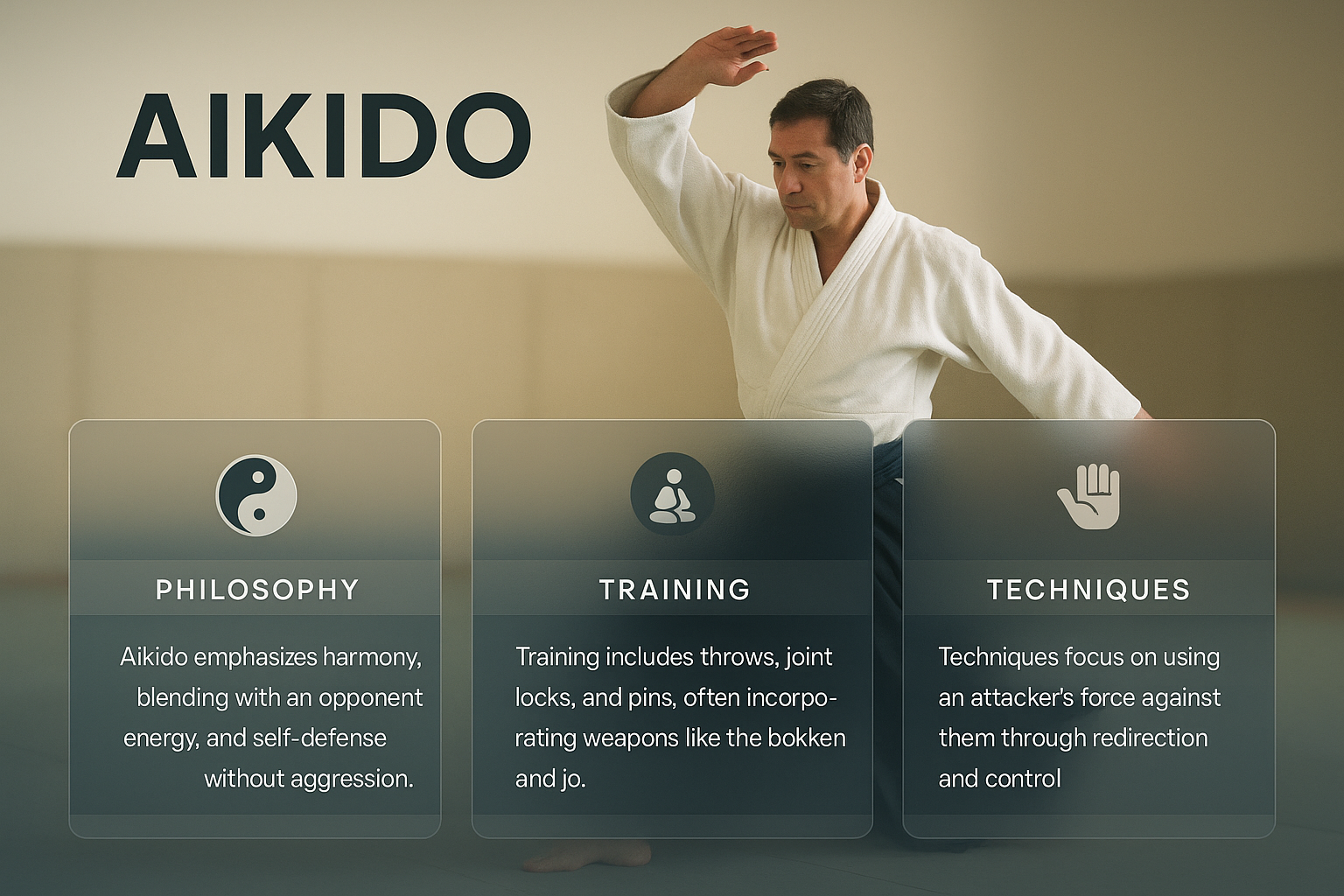 /Collection: /by davooda/Type: PNG/The image showcases a sleek web design concept for Aikido, featuring three horizontal blocks. Each block contains a title, icon, and text, all integrated with a stylish background.