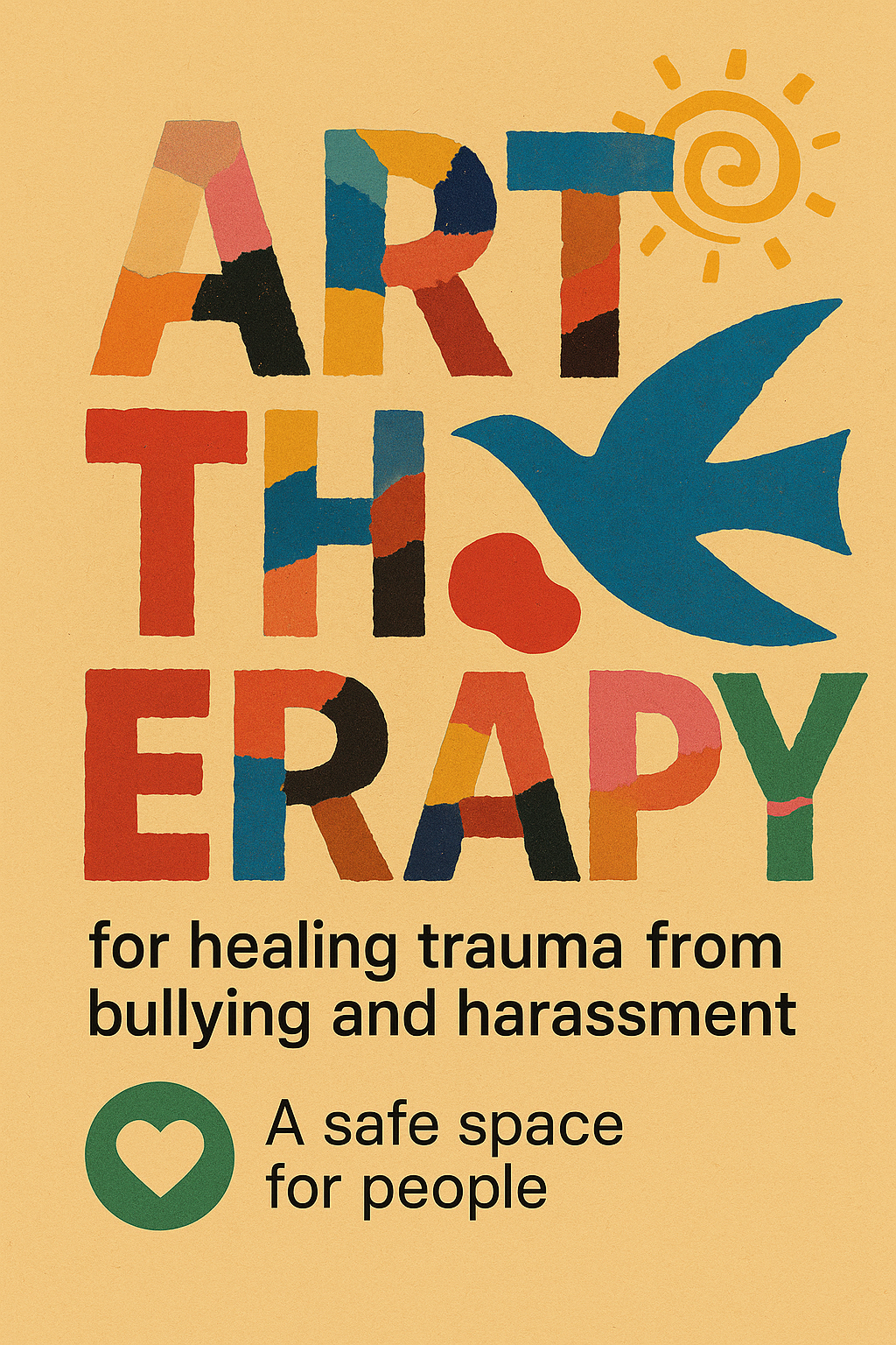 /Collection: /by davooda/Type: PNG/Vibrant promotional poster for art therapy, featuring bold, colorful typography and a soothing design aimed at creating a safe space for healing trauma from bullying.
