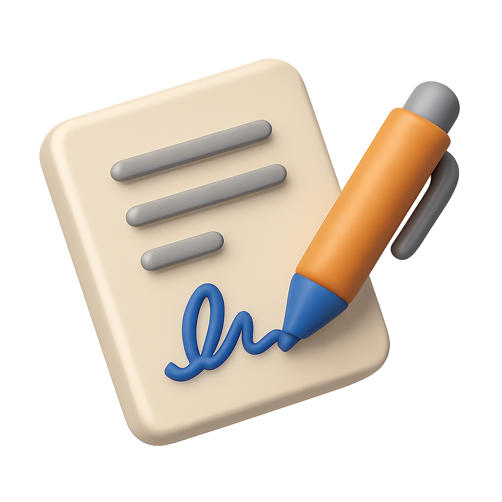 /Collection: /by davooda/Type: PNG/A visually appealing 3D icon displaying a notepad and a pen, designed in an isometric style with a transparent background, emphasizing a modern autograph concept.