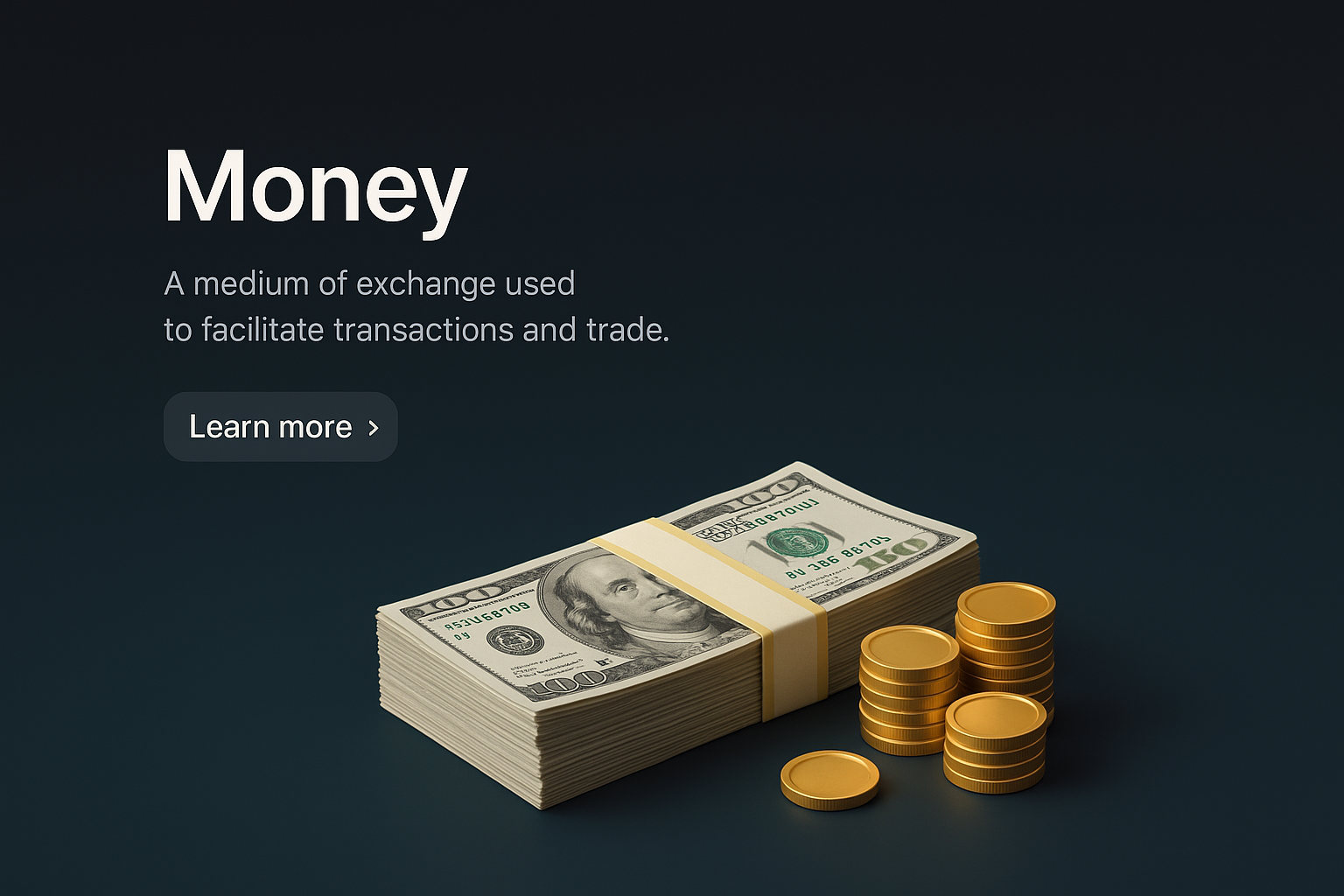 A detailed 3D scene featuring a stack of cash and gold coins on a dark gradient background, illustrating the concept of money in a visually appealing manner.