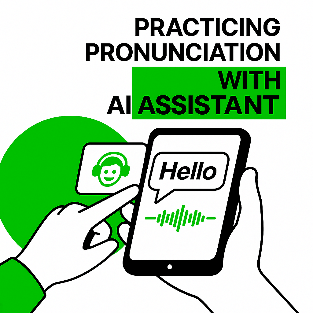 /Collection: /by davooda/Type: PNG/Digital illustration showcasing a user interacting with an AI assistant on a tablet, emphasizing language learning and pronunciation practice. The design features bold typography and vibrant colors, ideal for educational content.