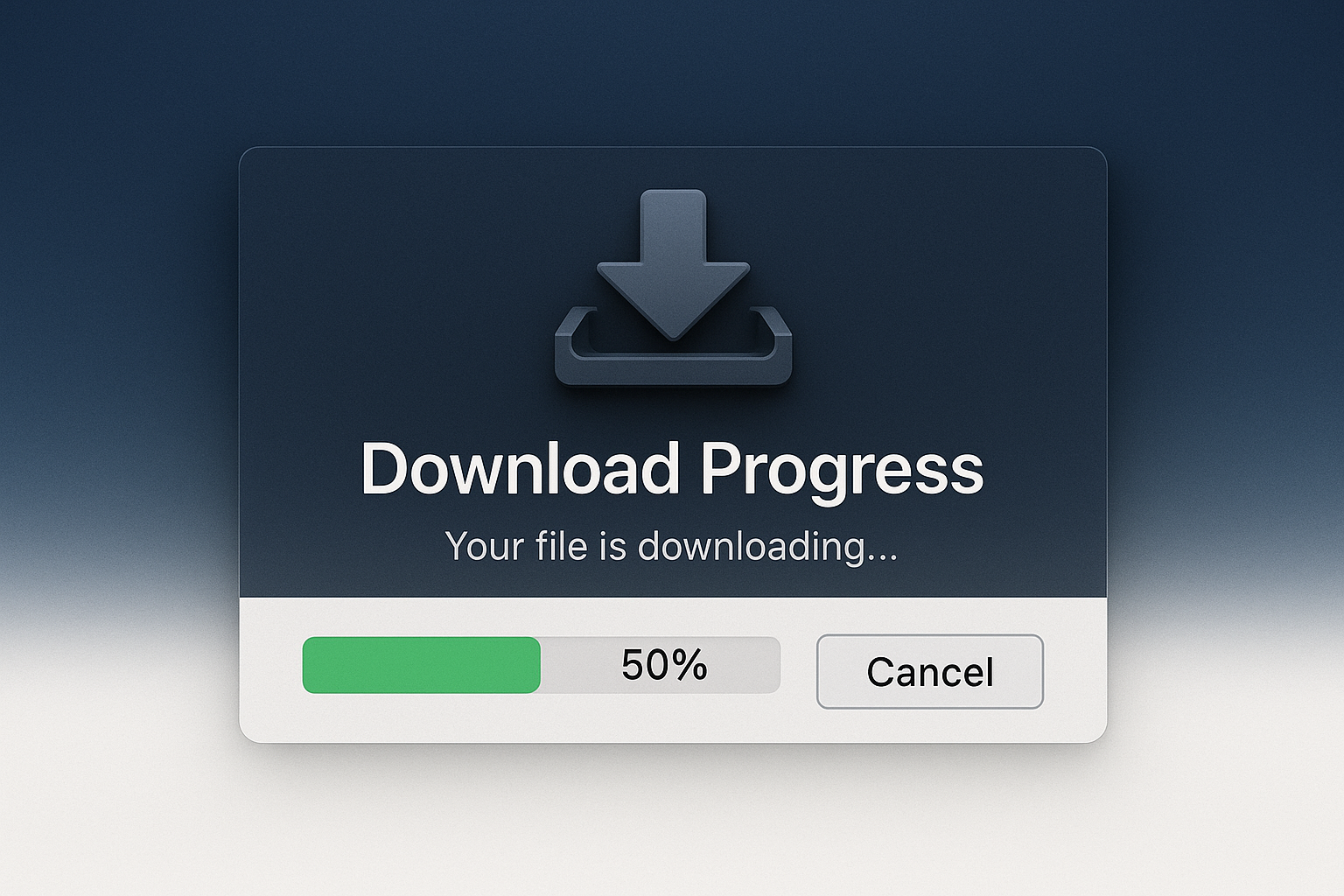 /Collection: /by davooda/Type: PNG/A sleek web interface showcasing a download progress bar. The design features a dark gradient background with a clear download icon, indicating 50% completion and a cancel option.