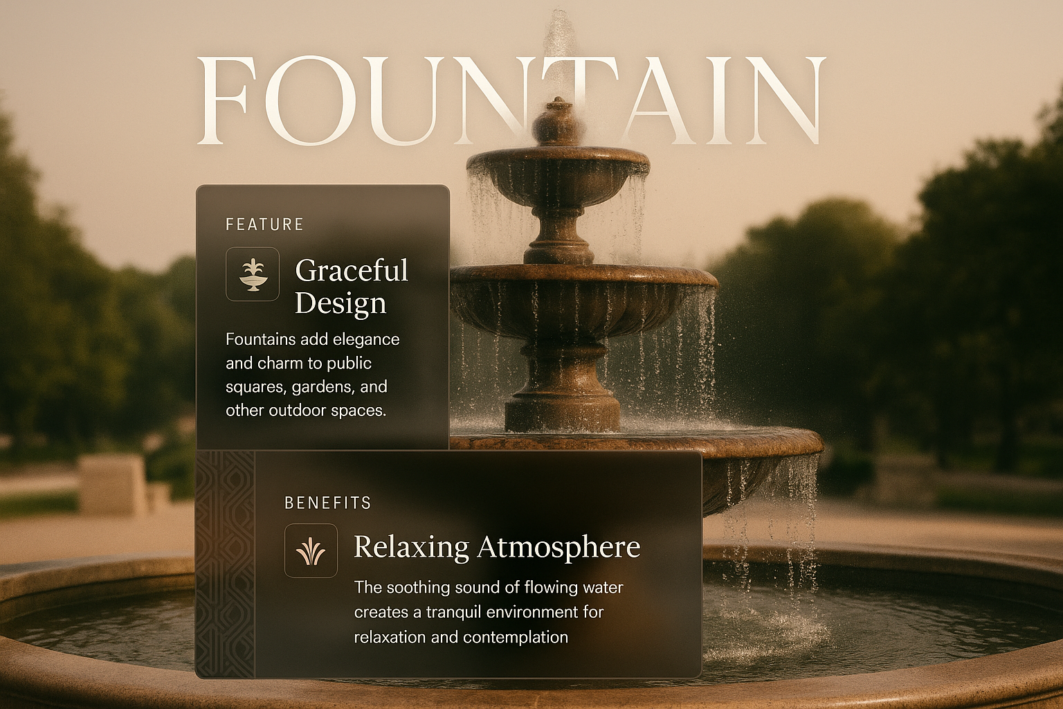 A beautifully designed fountain serves as the focal point, surrounded by lush greenery. Two informative blocks highlight features and benefits, set against a soft gradient background.