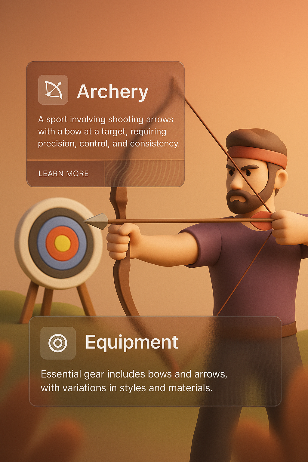 /Collection: /by davooda/Type: PNG/A dynamic 3D illustration showcases an archer aiming at a target, with two integrated text blocks providing informative descriptions about archery and equipment. The composition features a gradient background, enhancing visual depth.
