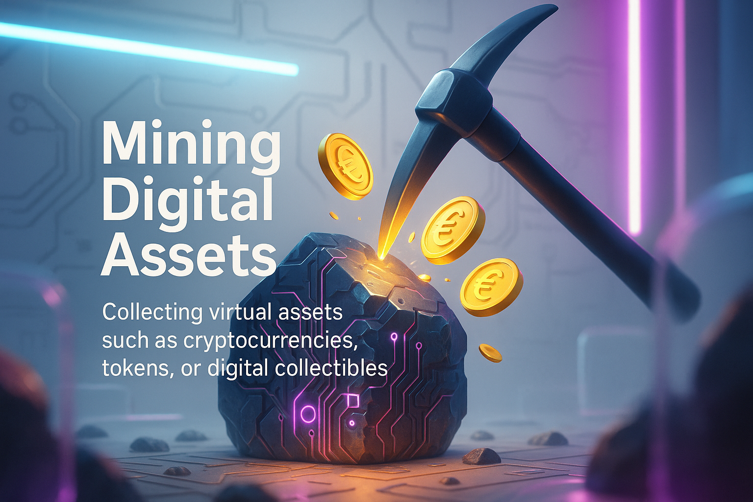 A vibrant 3D illustration depicting the concept of mining digital assets, featuring a virtual rock and cryptocurrency tokens. Ideal for blockchain and cryptocurrency marketing.