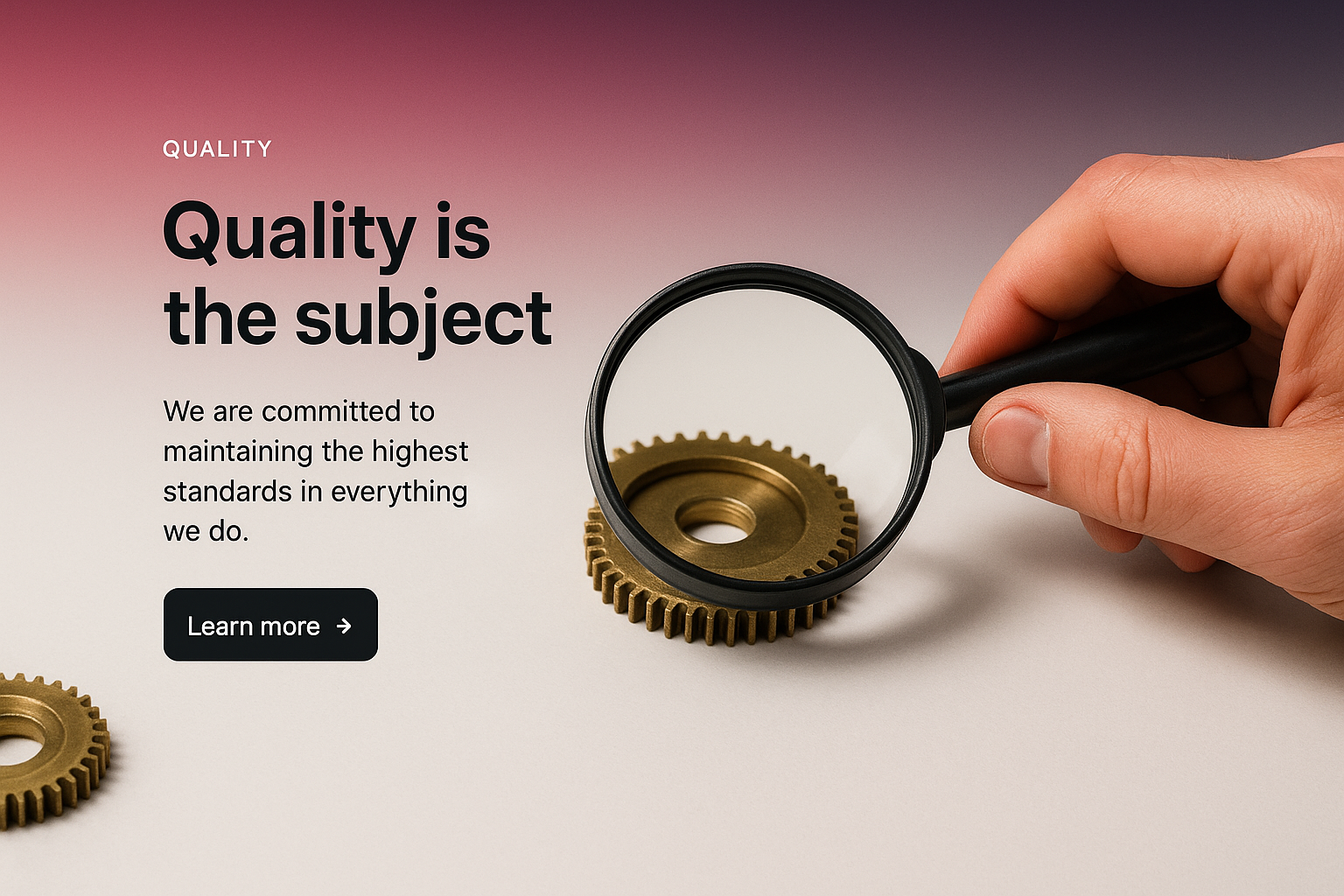 /Collection: /by davooda/Type: PNG/The image showcases a sleek web page design emphasizing quality. Features include a magnifying glass over a gear, a bold headline, and a call-to-action button against a gradient background.