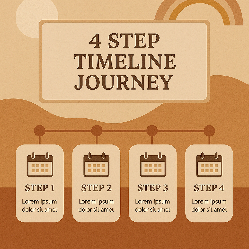 A visually appealing boho-style infographic featuring a 4-step timeline journey. Each step is represented with calendar icons and descriptive placeholders, set against a warm, gradient background.