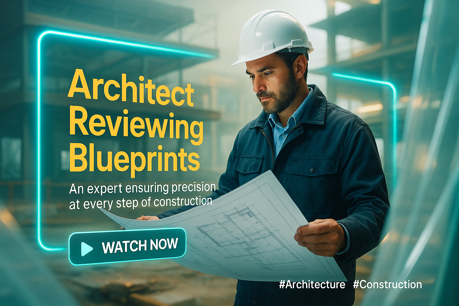 /Collection: /by davooda/Type: PNG/Professional image of an architect carefully examining blueprints in a construction site, featuring modern design elements. Ideal for construction and architecture promotional content.