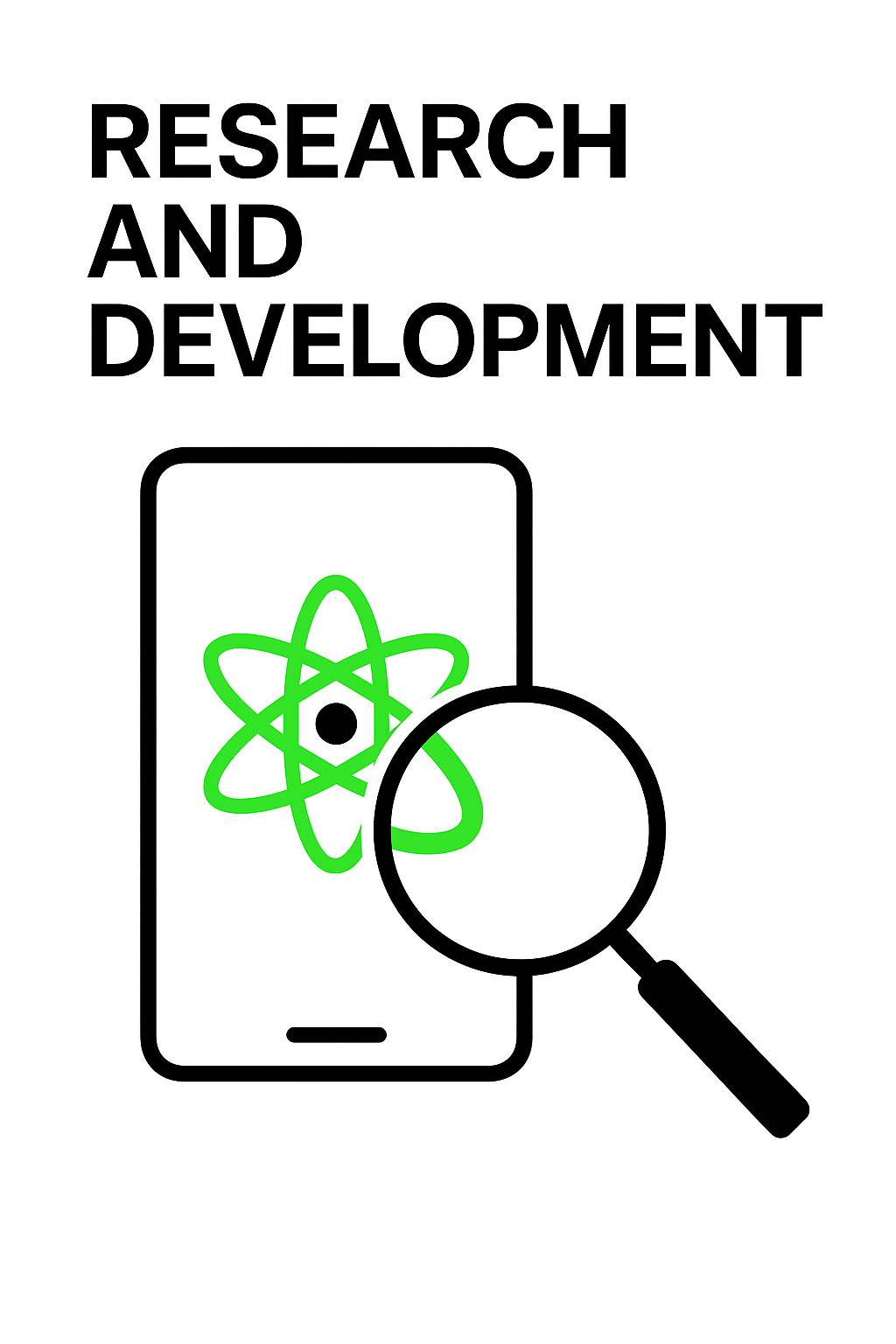 /Collection: /by davooda/Type: PNG/Minimalistic graphic illustrating the concept of research and development, featuring a smartphone and magnifying glass, suitable for tech or innovation presentations.