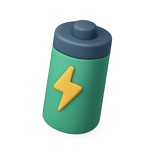 3D-rendered battery icon featuring a modern design with a lightning bolt, ideal for technology-related branding or app interfaces.
