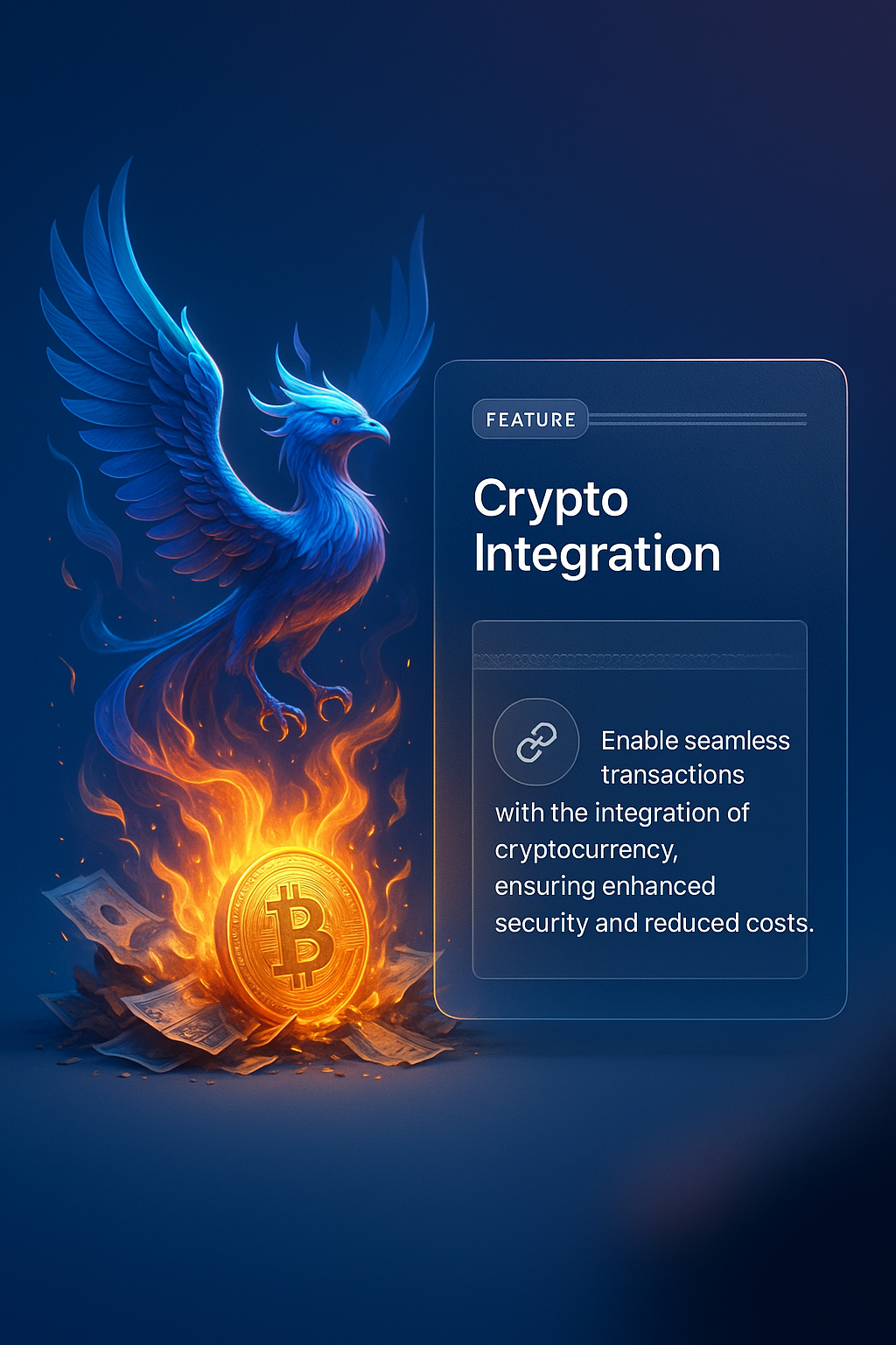 /Collection: /by davooda/Type: PNG/A vivid illustration of a phoenix emerging from flames, symbolizing rebirth and innovation in cryptocurrency, with an integrated feature block highlighting crypto integration.