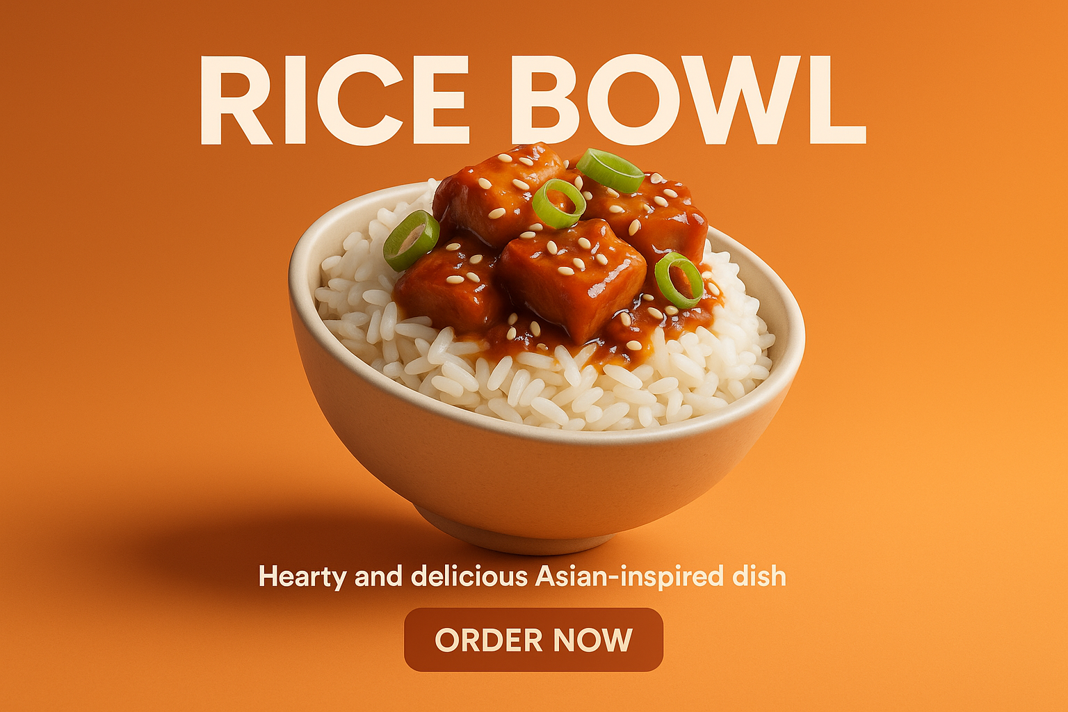 Delicious Rice Bowl Promotional Image with Vibrant Background