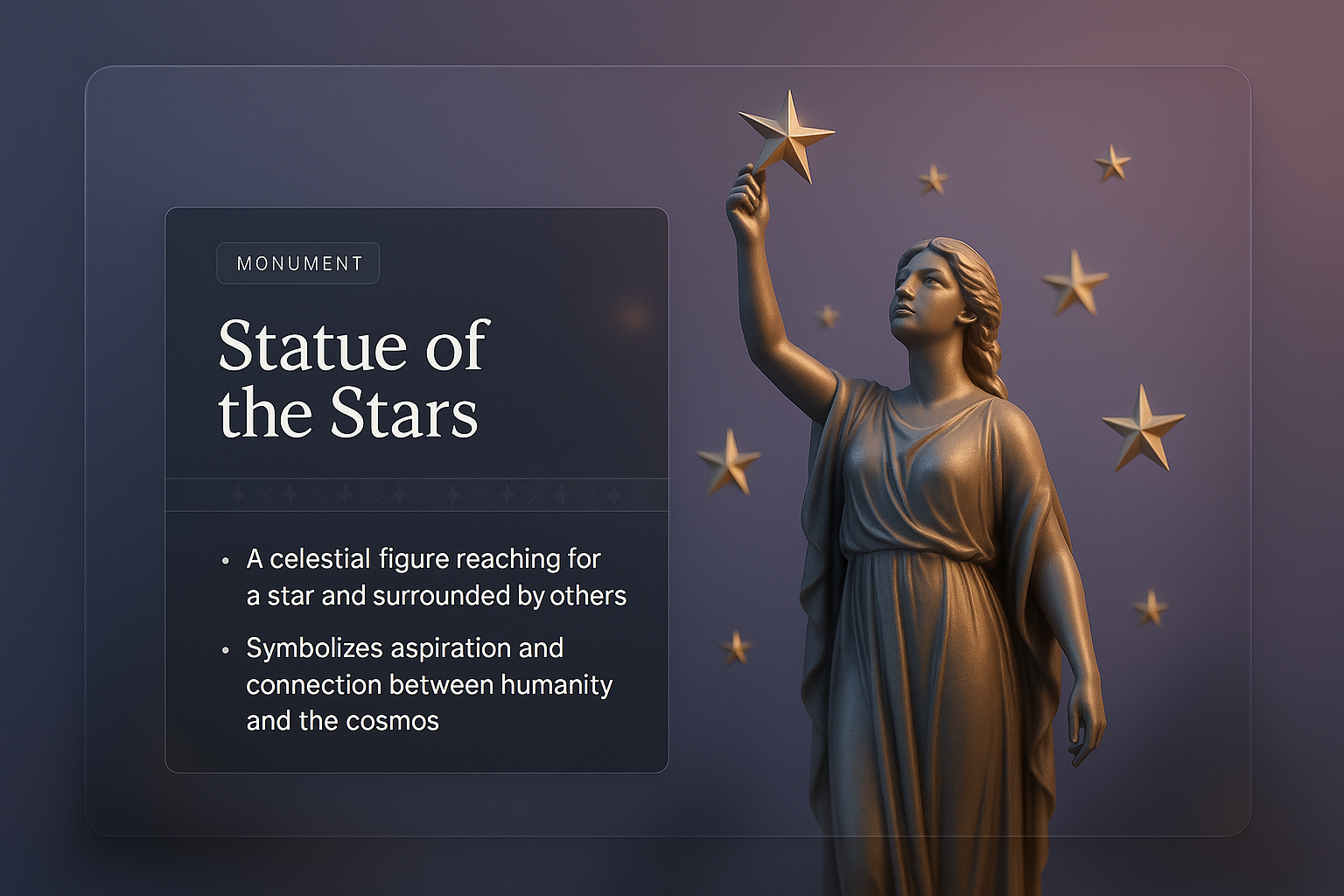 A beautifully crafted statue of a woman reaching for a star, surrounded by other celestial bodies. The design integrates a dark translucent panel with informative text.