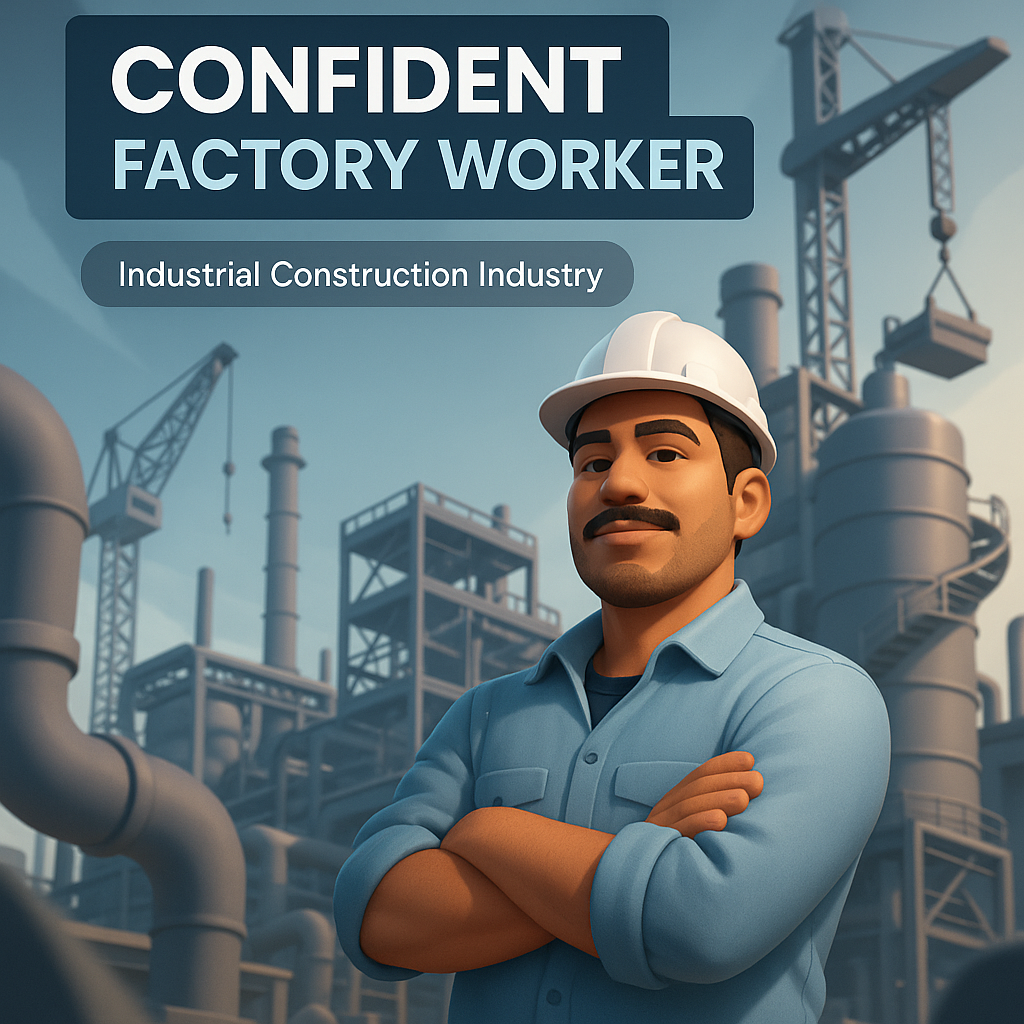 /Collection: /by davooda/Type: PNG/This is a digital illustration of a confident factory worker set against an industrial backdrop. It features a stylized character and is suitable for promotional or informational use in the construction sector.