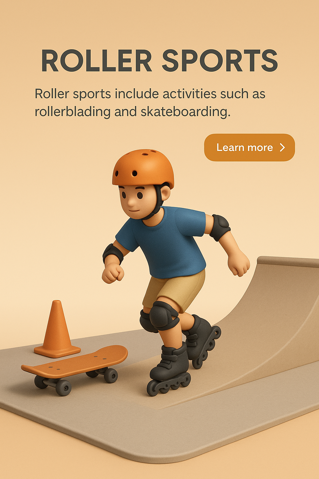 /Collection: /by davooda/Type: PNG/A visually appealing 3D illustration showcasing roller sports, featuring a character rollerblading near a skateboard. The background is a smooth gradient with minimal details.
