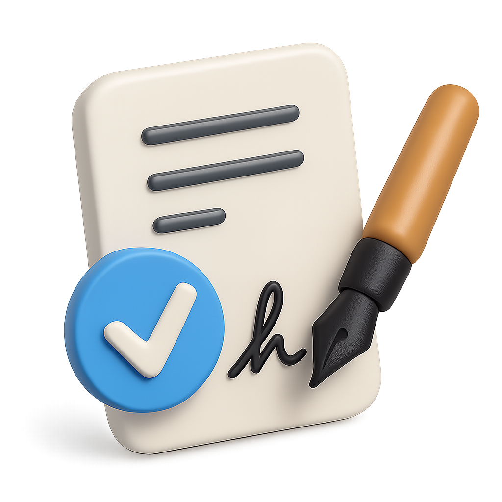 An artistic representation of a document featuring a checkmark and a fountain pen. The document is stylized with lines and a signature, set against a gradient background.