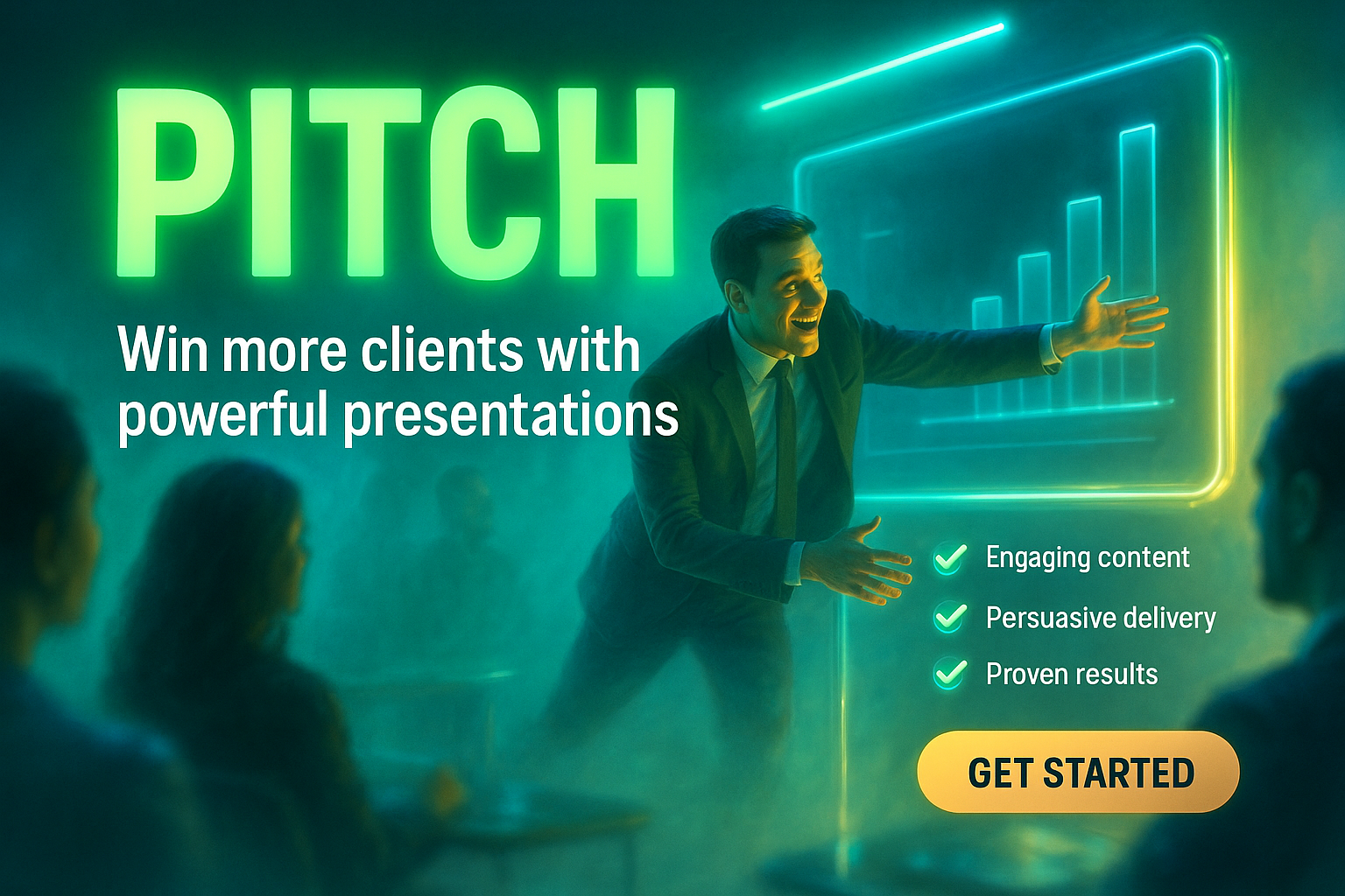 A vibrant neon-themed slide featuring a presenter engaged in a captivating pitch. The scene is illuminated with neon accents and a soft, foggy background, enhancing the professional yet dynamic atmosphere.
