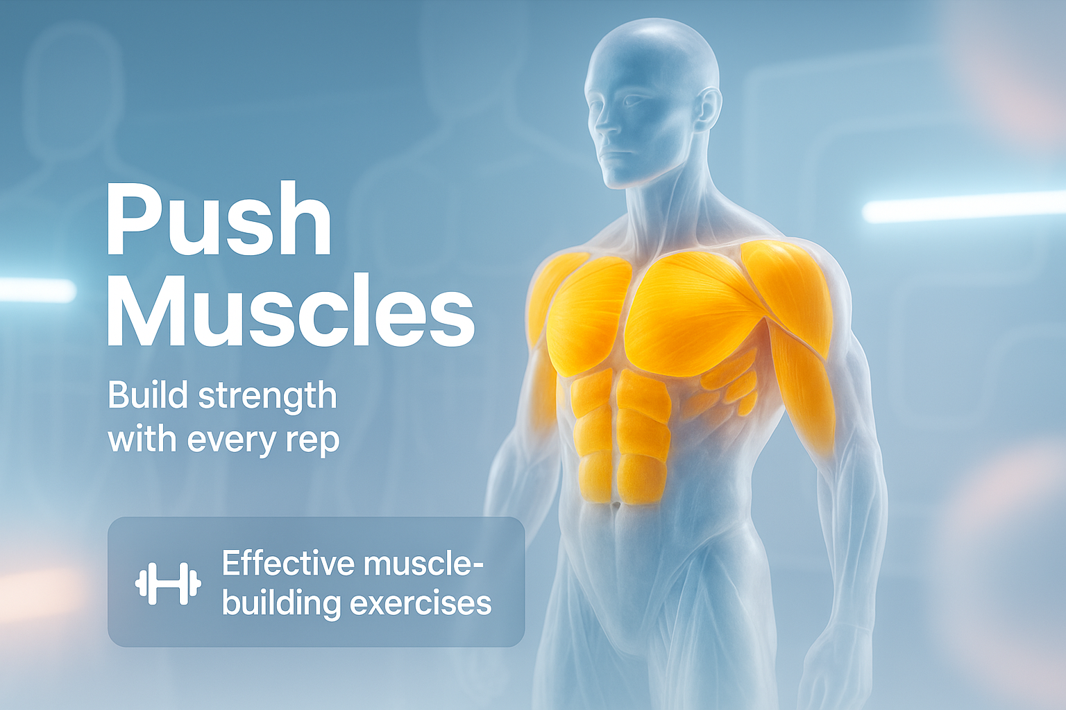 A visually engaging graphic showcasing the anatomy of push muscles with highlighted areas, designed for fitness enthusiasts. Ideal for gym promotions or workout guides.