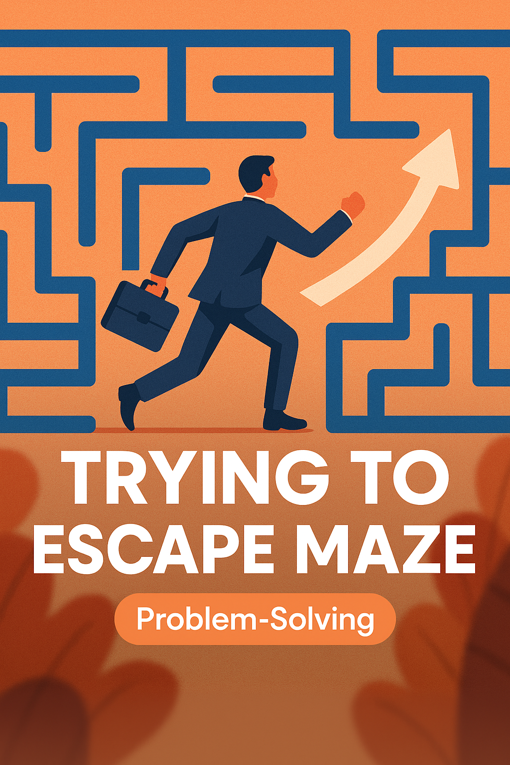 /Collection: /by davooda/Type: PNG/A vibrant illustration depicting a businessman running towards an exit in a maze, symbolizing problem-solving and navigation. Ideal for motivational content or business presentations.
