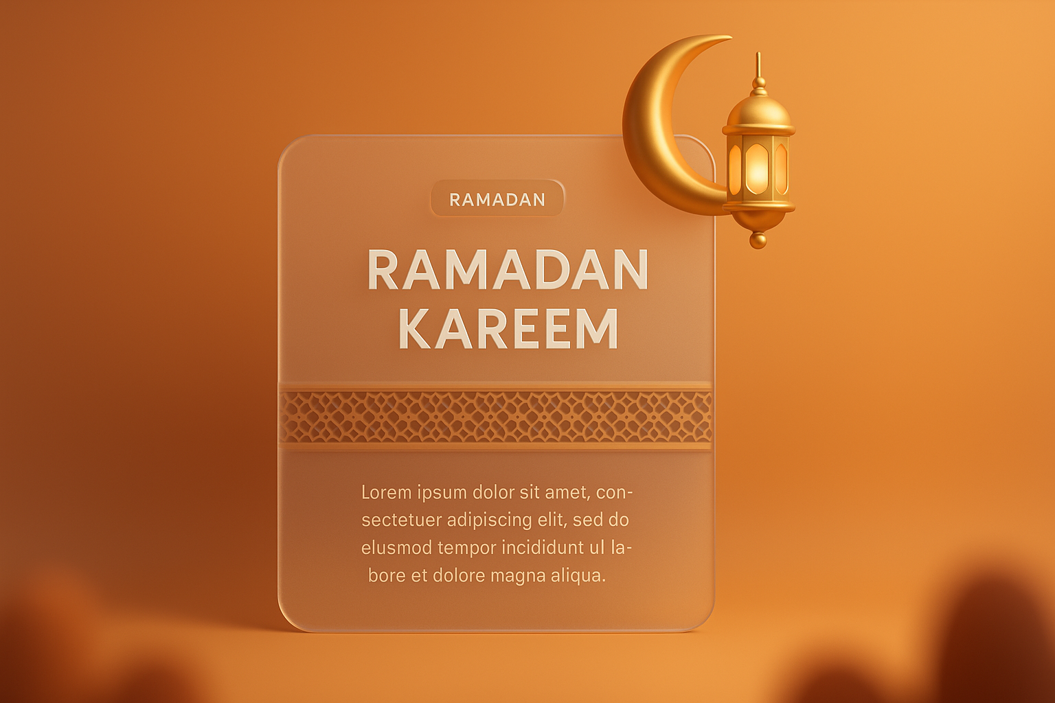 /Collection: /by davooda/Type: PNG/A 3D illustration featuring a stylish Ramadan Kareem greeting card design. It includes a translucent panel with intricate patterns, a lantern, and warm gradient colors, creating a festive atmosphere.