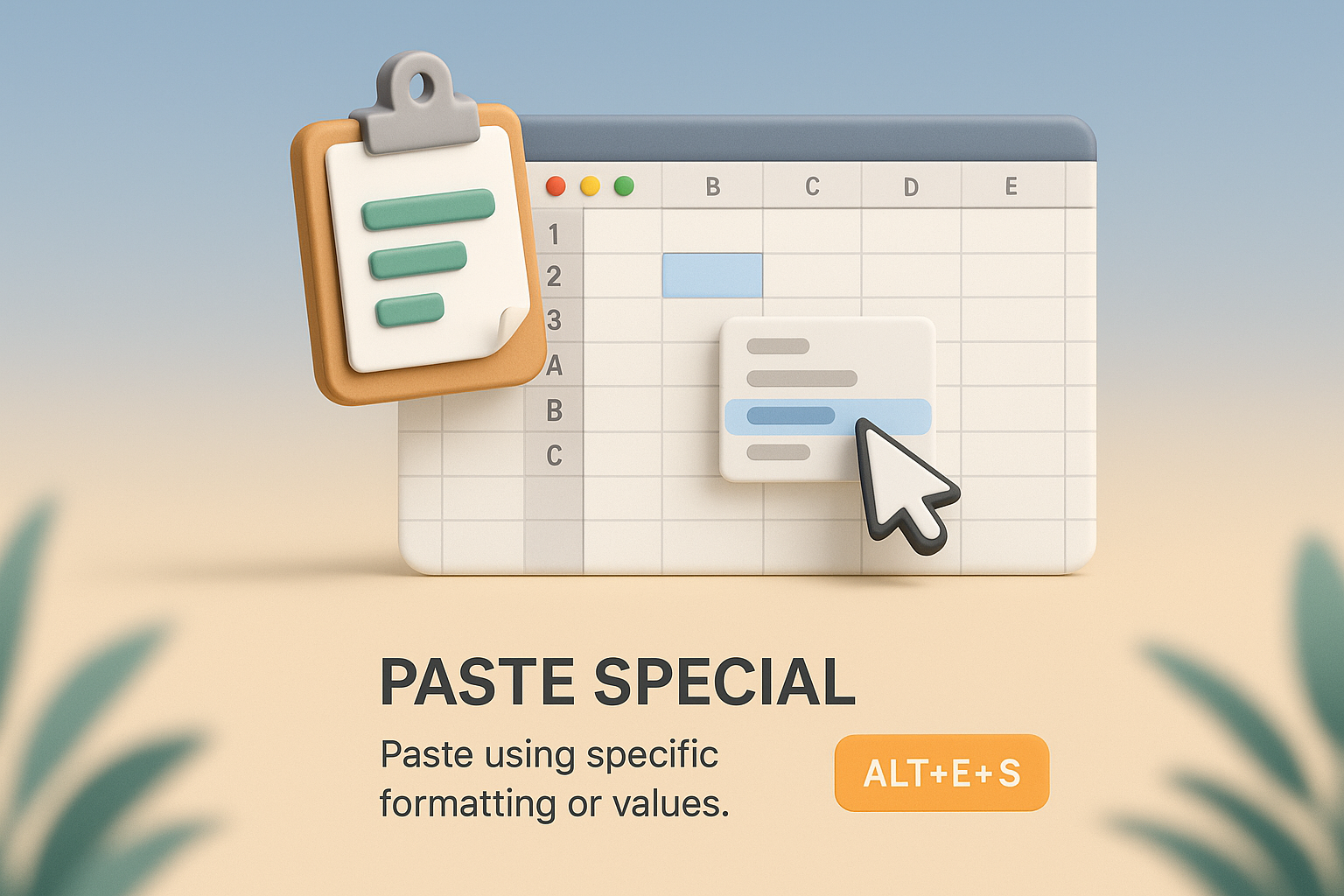 /Collection: /by davooda/Type: PNG/A zoomed-out 3D illustration depicting the 'Paste Special' concept, featuring a spreadsheet interface, clipboard, and cursor. The design has a smooth gradient background and layered composition for depth.